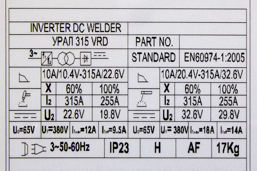 Аппарат инверторный Урал 315 VRD ММА;Руководство по эксплуатации;Технологический паспорт;Картонная упаковка. |