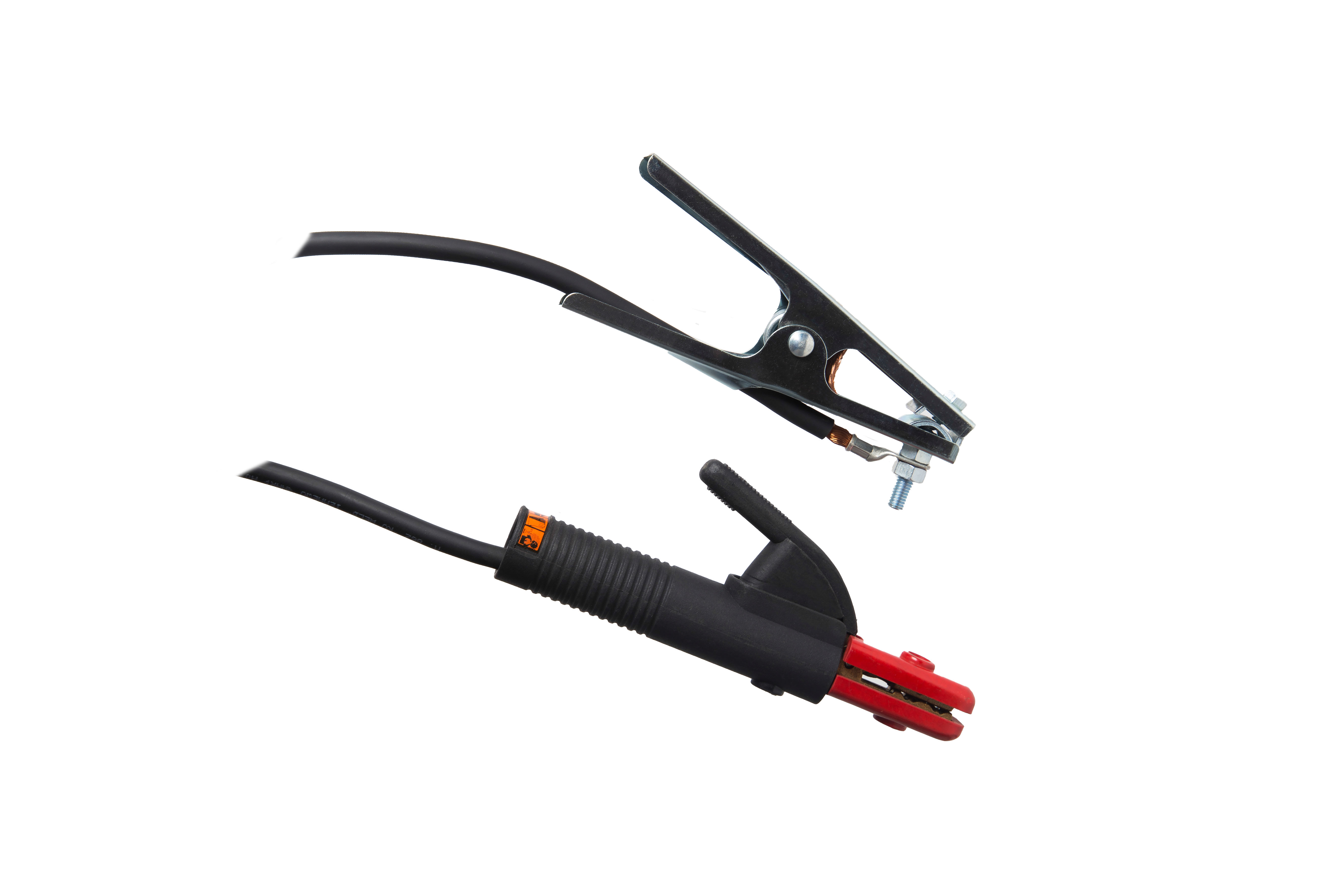 Кабель с электродержателем, кабель с клеммой заземления, проволочная щётка и молоток для удаления шлака, щиток сварщика для руки, ремень для переноски, кейс. |