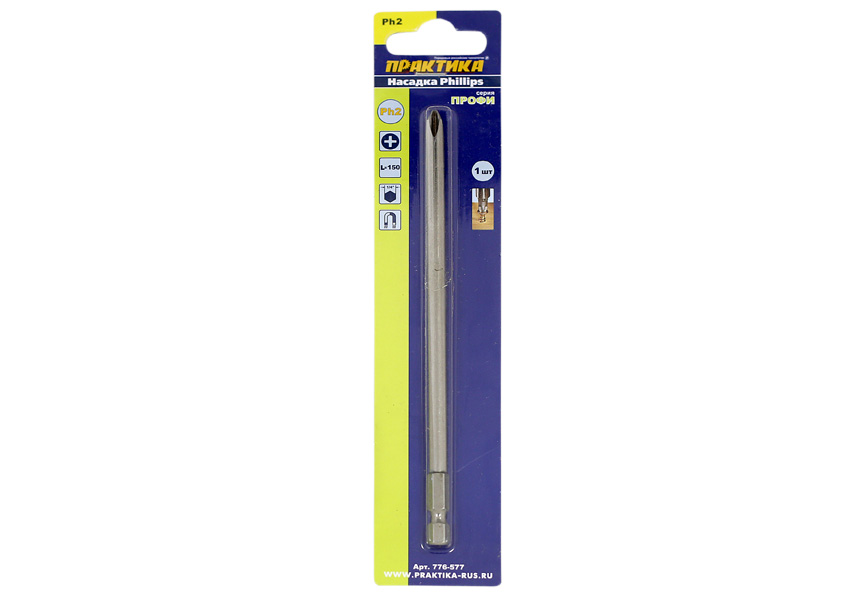Бита Профи 776-577 РН-2 150 мм ПРАКТИКА 1 шт можно использовать как в быту, так и при решении профессиональных задач. В комплект входит одна 150-миллиметровая бита традиционного конструктивного исполнения. Шлиц – РН-2 Бита изготовлена из высококачественной стали S2. Инструмент обладает высокой стойкостью к усталостным и ударным нагрузкам. Набор рассчитан на длительное использование. Дополнительным преимуществом является то, что бита имеет магнитные свойства.