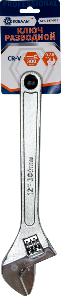 Ключ разводной 0-36 мм КОБАЛЬТ 647-536, предназначен для завинчивания/отвинчивания резьбового крепежа и трубных соединений. Изготовлен из хромванадиевой (CrV) стали. Ключ имеет прочный червячный механизм с подвижной губкой и наиболее удобен для работы в широком диапазоне типоразмеров болтов и гаек с шестигранными головками 8-36 мм, при относительно низких нагрузках. Общая длина 300 мм, раскрытие губок (ширина захвата) 0-36 мм, толщина губок 10мм.