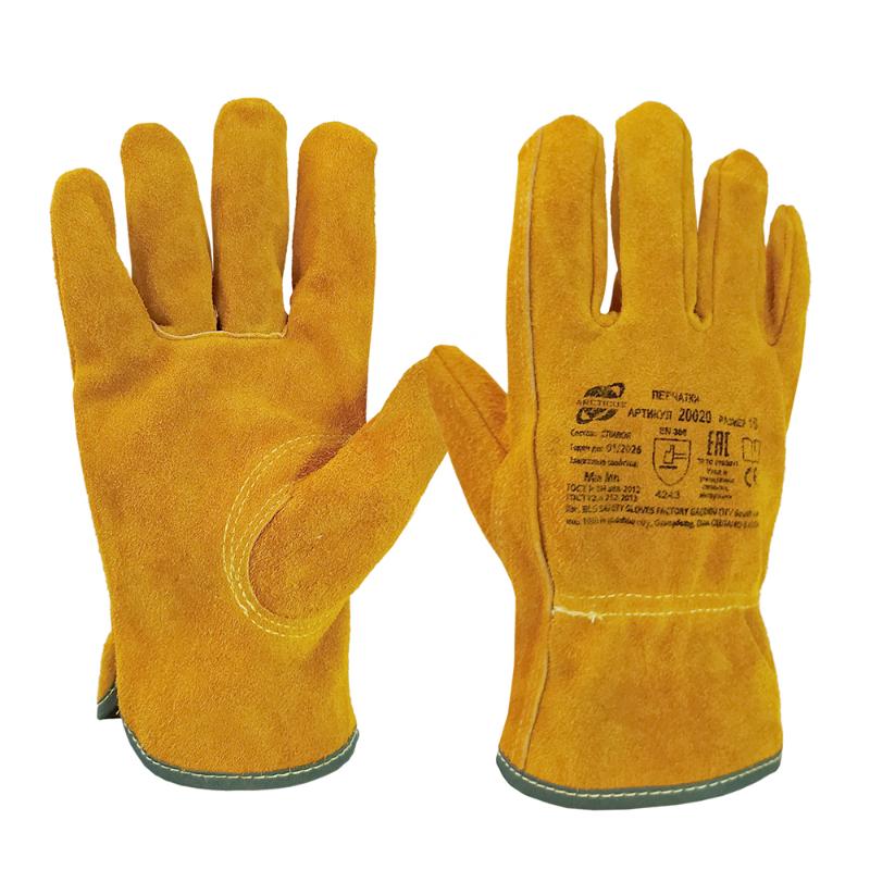 Arcticus 20020 — перчатки из спилка желтого (золотистого) цвета. Спилок шлифованный, мягкий, толщиной 1,3 мм. Предназначены для защиты рук от ОПЗ и истирания. Обеспечивают высокий комфорт, рекомендованы для продолжительного ношения, при работе с инструментом. Вшитый большой палец.